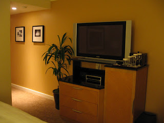 So the flight was nice - had a wonderful conversation with an elderly man who was very open, honest and friendly. We landed and it was smooth getting to baggage claim. The taxi line was a bit out of control, but once I got in I was good to go! He drove FAST but it was great to take in the whole city. I am SMACK downtown - LOVE IT - the city is just awesome. The hotel I'm at is great! I had every intention of going out to eat but wow - once I got here I just crashed! I took tons of pictures of the room and ordered room service. Now i'm snuggled up online watching Sex and the City Season 2 on DVD - awesome!!! Here's pics.... I LOVE this room...